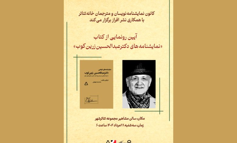 رونمایی از کتاب «نمایشنامههای دکتر عبدالحسین زرینکوب» توسط کانون نمایشنامهنویسان و مترجمان خانه تئاتر و با همکاری نشر افراز در تئاتر شهر برگزار میشود.